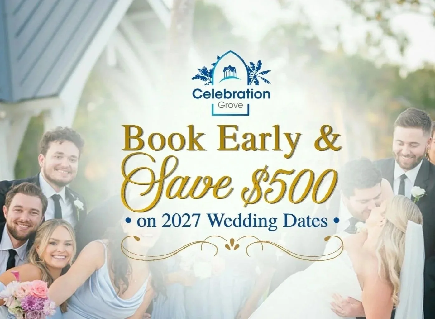 Offer valid for new 2027 Ceremony + Reception Wedding Package bookings only and requires a signed contract and non-refundable deposit within 7 days of your tour date. Discount will be applied to current package pricing at the time of booking and is based on applicable peak & off-peak seasonal rates. This promotion may also be combined with Celebration Grove’s 10% discount for military families (bride, groom, or parents), as well as first responders & teachers (bride/groom only). Excludes ceremony-only packages, reception-only packages, previously booked events, transferred dates, & cannot be applied retroactively to existing contracts. Subject to venue availability.