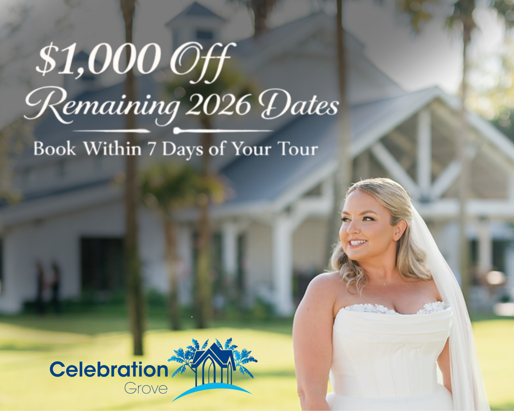 Offer valid for new 2026 Ceremony + Reception Wedding Package bookings only and requires a signed contract and non-refundable deposit within 7 days of your tour date. Discount will be applied to current package pricing at the time of booking and is based on applicable peak & off-peak seasonal rates. This promotion may also be combined with Celebration Grove’s 10% discount for military families (bride, groom, or parents), as well as first responders & teachers (bride/groom only). Excludes ceremony-only packages, reception-only packages, previously booked events, transferred dates, & cannot be applied retroactively to existing contracts. Subject to venue availability.