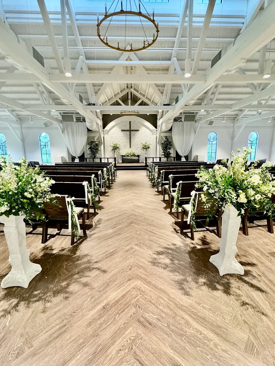 Pew-style cushioned seating for indoor chapel ceremonies.